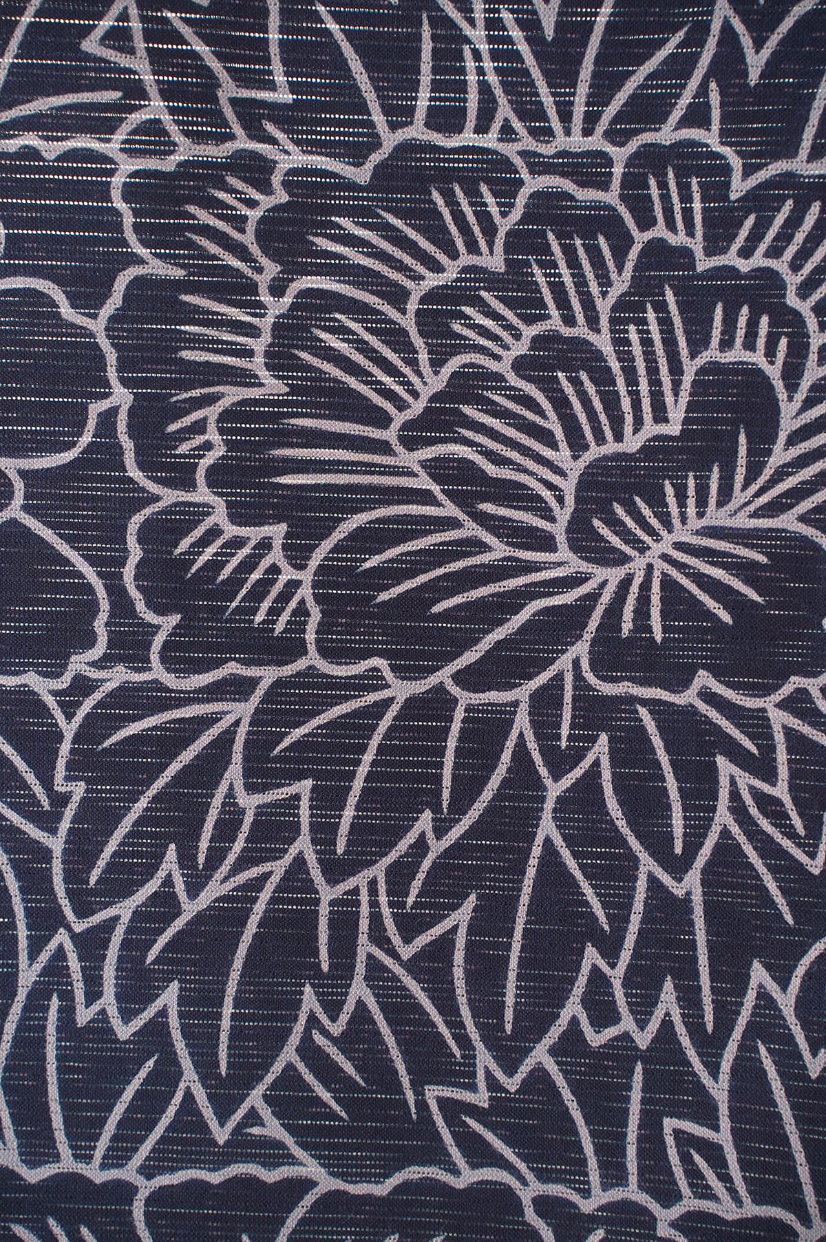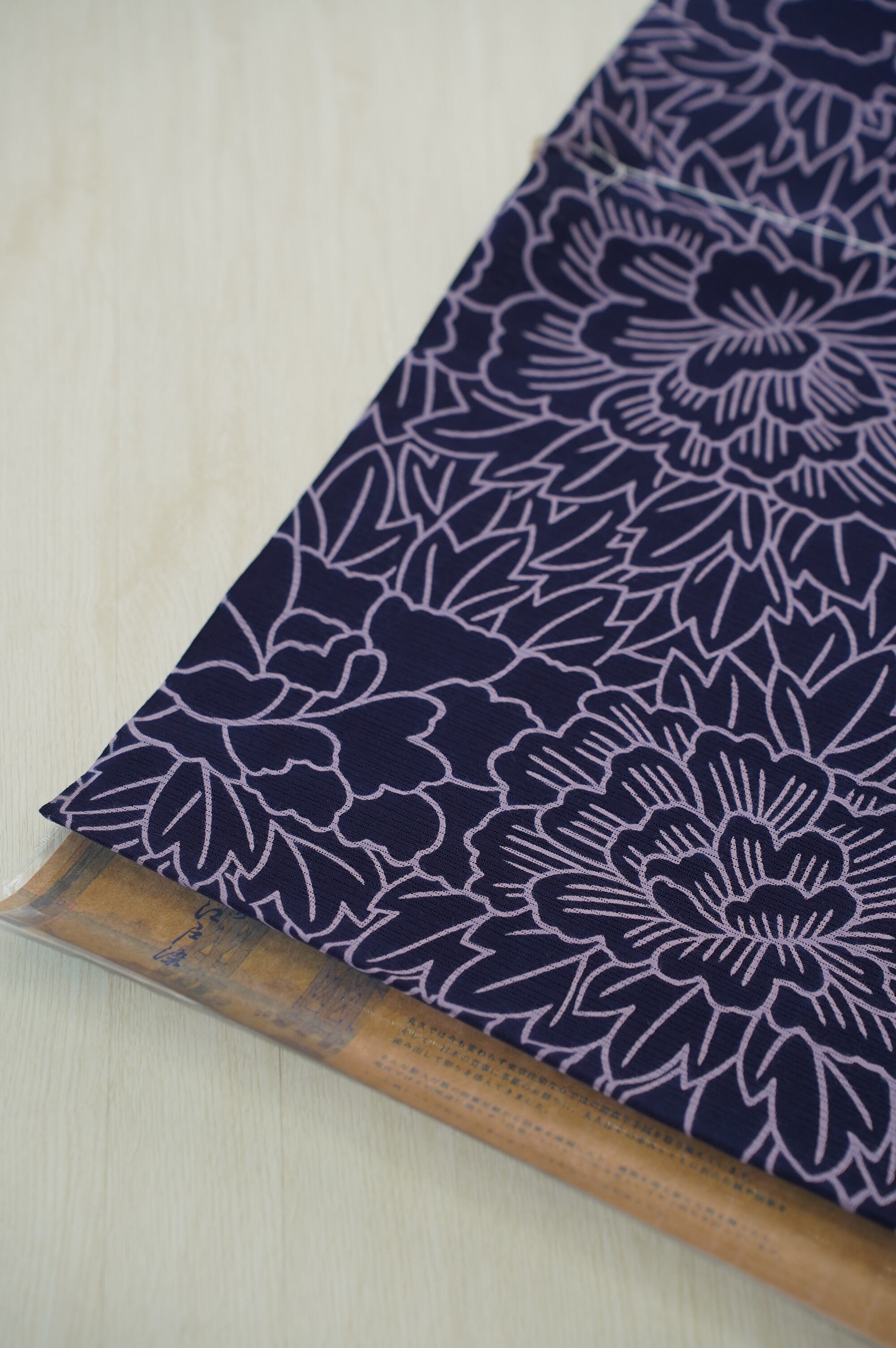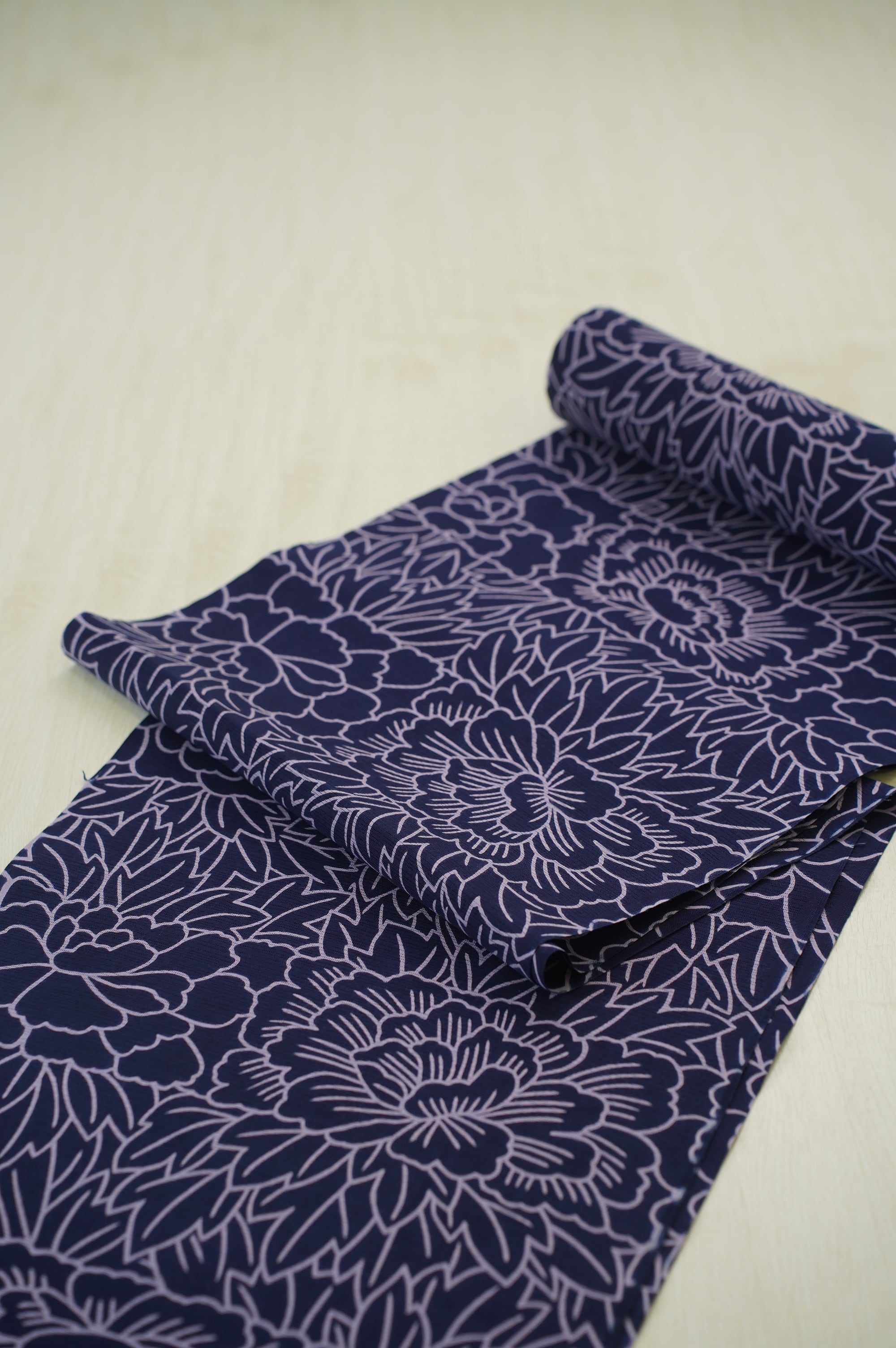 紫地に牡丹の花がシルエットで描かれた優雅で女性らしい浴衣です。