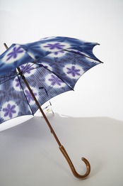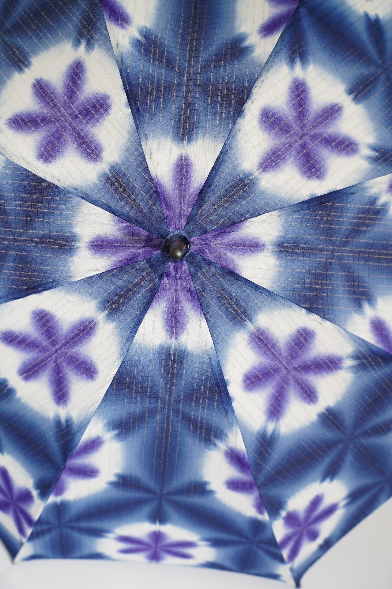 板締め絞りで染め出された幾何学模様の傘を開くと、まるで大きな万華鏡を見上げているようです。